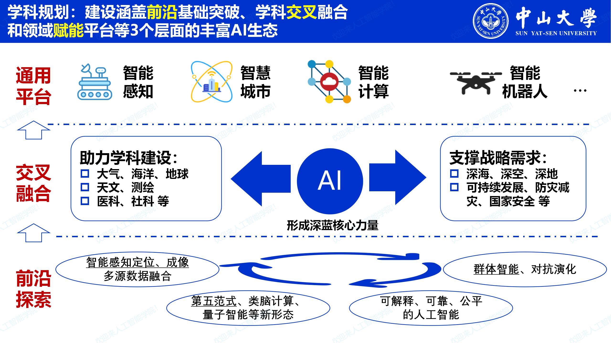 学院矢志建设涵盖前沿基础突破、学科交叉融合与领域赋能平台等3个层面的丰富AI生态。在前沿探索层面深入开展“人工智能可解释性、可靠性、公平性”,“智能感知、定位、与成像”、“群体智能与对抗演化”、“科学智能第五范式”等领域的基础研究;在交叉融合层面形成深蓝核心力量,助力大气、海洋、地球、天文、测绘、医学、社科等相关学科建设,支撑深海-深空-深地探索、双碳、防灾减灾等战略需求;并融汇上述方法和工具,在平台层面努力建成智能感知、智慧城市、智能计算、智能机器人等通用平台。