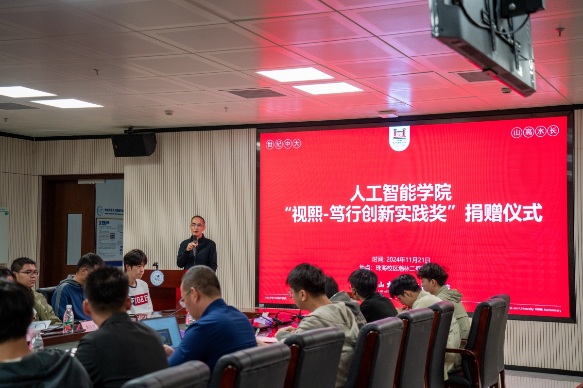 11月21日,人工智能学院“视熙-笃行创新实践奖“捐赠仪式在珠海校区瀚林2号举行。捐赠方珠海视熙科技有限公司(以下简称“视熙科技”)首席运营官(COO)李涛、公关经理林家骏、高级助理黄开德,学院师生代表出席,捐赠仪式由学院党委副书记李茂主持。