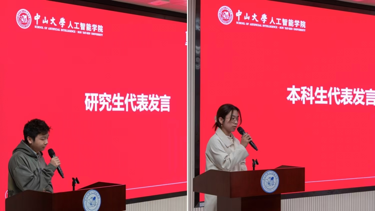 ▲研究生代表邓世元、本科生代表黄江琪发言