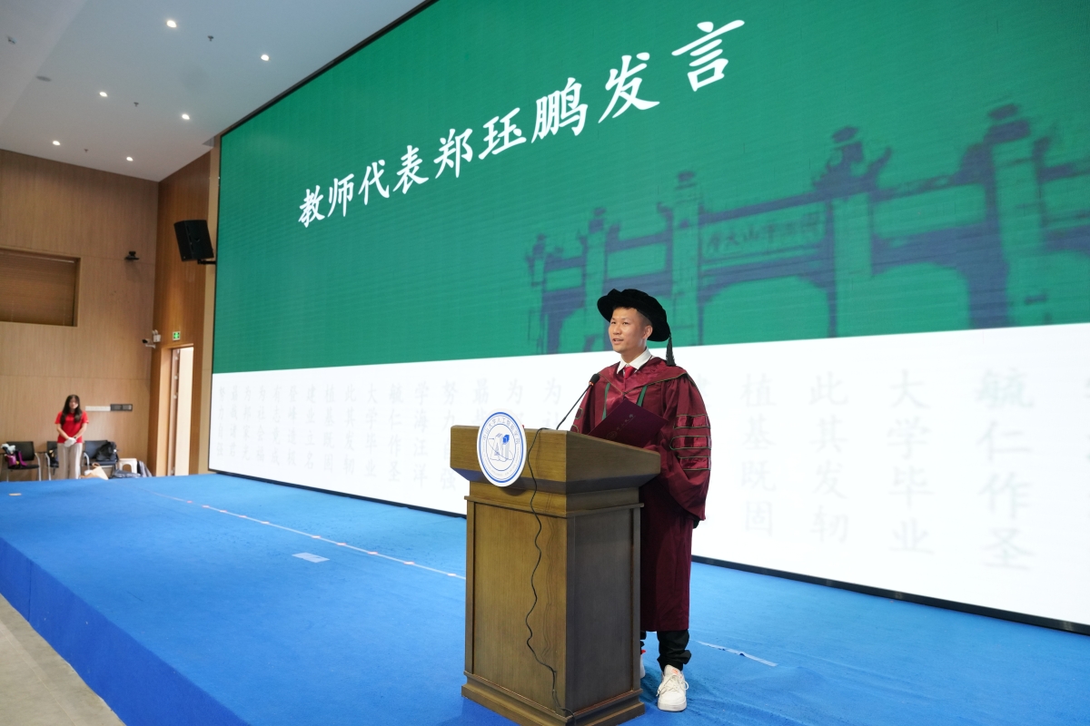 教师代表郑珏鹏助理教授以“热爱、合作、学习”为关键词寄语毕业生:“人工智能学科的发展需要跨学科融合的开放心态,更需要终身学习的谦卑。无论未来走向何方,保持对技术的热爱与对生活的热忱,是你们最珍贵的底色。”他的话语里,既有师者的期许,更有“过来人”的共鸣。