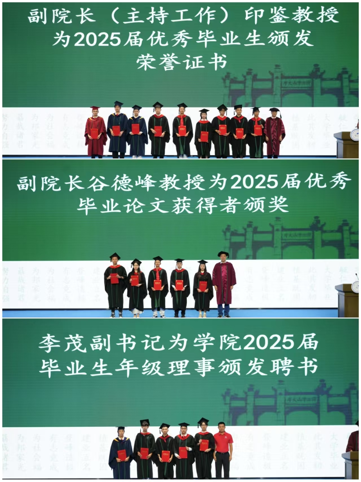 仪式以荣誉礼赞成长。副院长印鉴教授为2025届优秀毕业生颁发荣誉证书;副院长谷德峰教授为优秀毕业论文获得者颁奖;李茂副书记为年级理事颁发聘书。