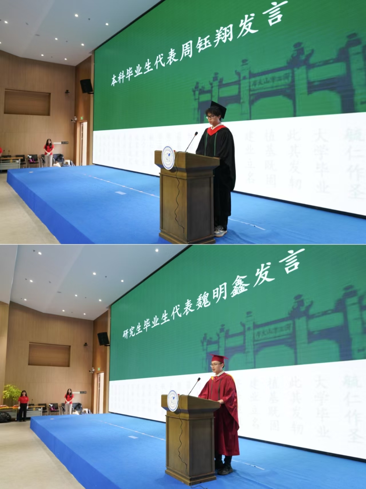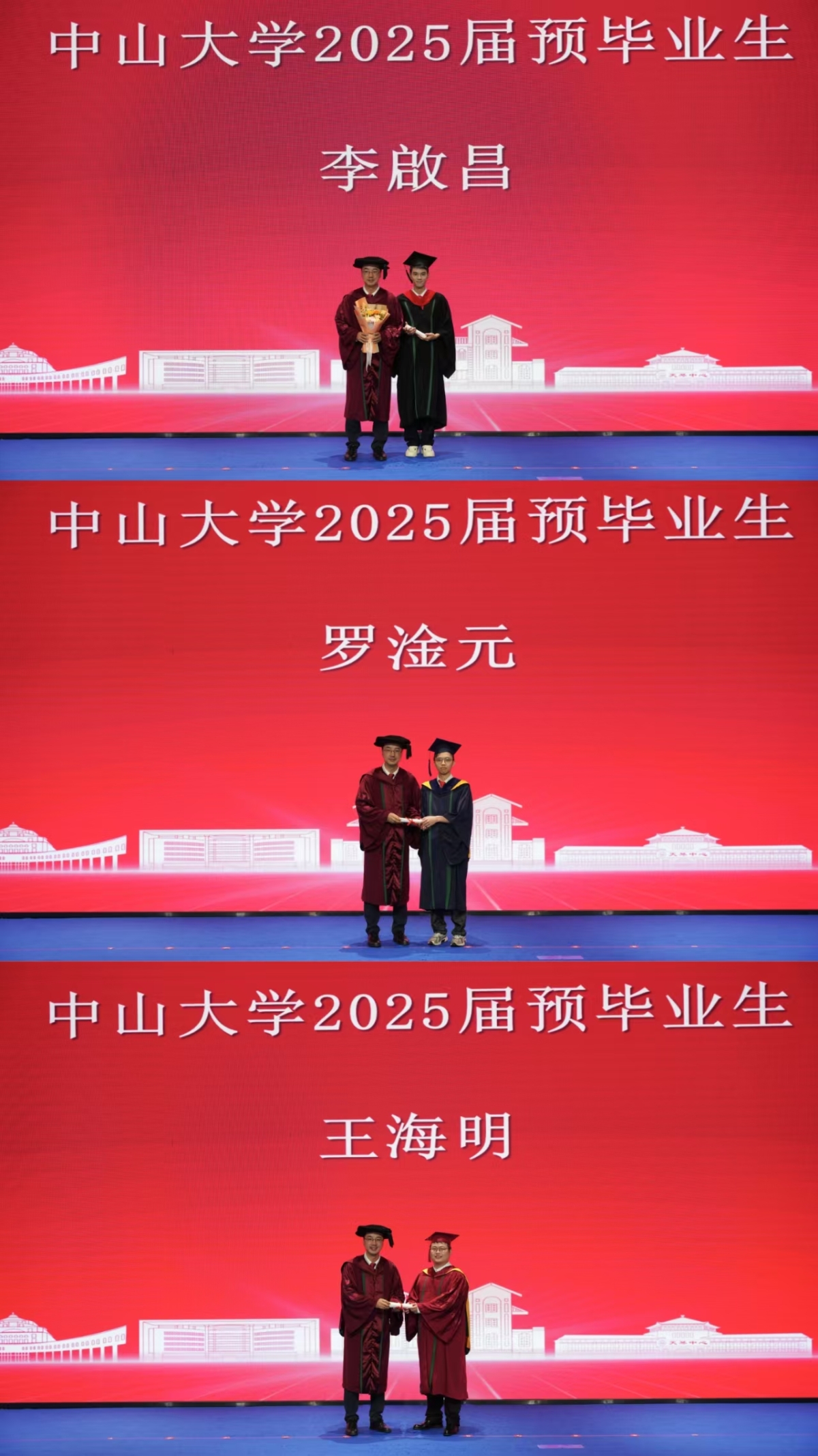 在亲友的目光与同窗的陪伴中,毕业生们带着求学的成长印记踏入会场。下午三点,庄严的国歌声为仪式拉开序幕。党委书记赵立子宣读孙中山先生毕业训词,“为社会福,为邦家光”的谆谆教诲在会场回响,全体毕业生齐声回应“谨遵教诲”,将中大精神融入青春誓言。