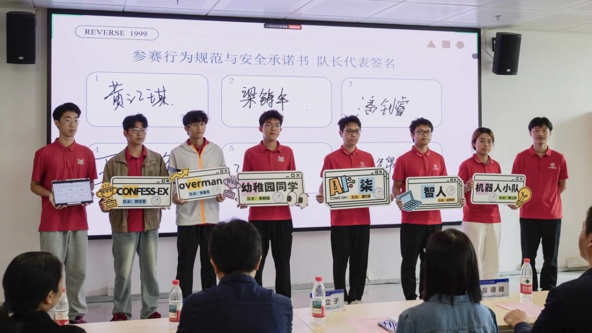 “智境空间”揭牌后,“中山大学第一届智境未来人形机器人格斗赛”正式启动。中山大学第一届智境未来人形机器人格斗赛由人工智能学院主办,并由中山大学AI智境未来社承办,聚焦于人形机器人格斗,正面向全校学生接受报名,首批参赛队长代表们现场签署了安全承诺书,一场融合AI策略与实时决策的终极较量,将于今年11月下旬精彩上演。