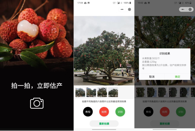 经过数月的技术攻关和反复验证,突击队成功将实验成果转化为实用工具,开发出“荔枝估产宝”小程序。在柏桥村荔枝广场的实地应用中,这套系统展现出很好的精准度:对于3棵荔枝树进行估产,小程序估产结果为746斤,采摘后的实际称重结果约750斤。后续突击队将继续优化估产小程序的算法,进一步提高估产小程序的准确率和稳定性。“荔枝估产宝”小程序正在准备上线中,敬请期待。