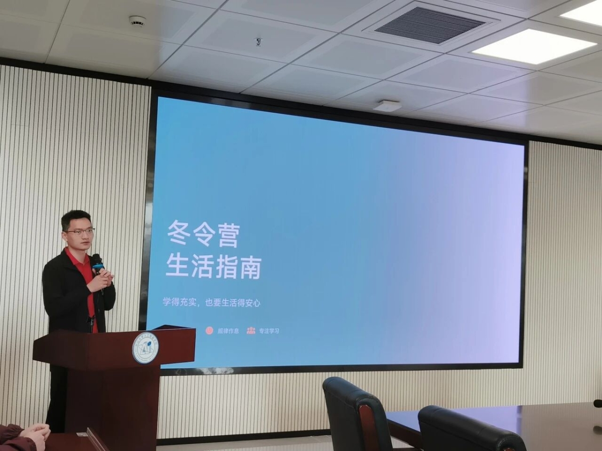 蒋滔老师为营员介绍冬令营期间的生活指南,内容涵盖每日作息安排、纪律安全规范以及电子设备使用管理制度。他希望各位营员在接下来的时间里,既能潜心学习、收获满满,也能生活有序、安心愉快,共同度过一段充实而安全的冬令营时光。